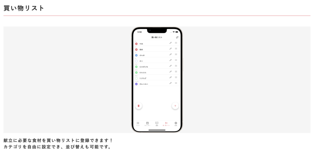こちらのアプリでは、カレンダー式の献立と買い物リストをこれ一つで管理できます。