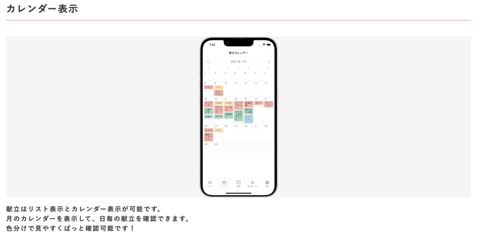 カレンダー表示により、過去の献立も簡単に見ることができます。