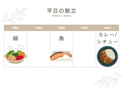 例えば我が家の場合、月曜日は「鍋」水曜日は「魚料理」金曜日は「カレーorシチュー」と決めています。